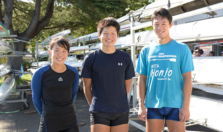 Atsushi Birukawa:My interest in rowing started at my high school in Akita Prefecture. There’s a river in the city where I went to school, and rowing was popular, and well, the rest is history. Initially, I’d thought rowing was merely about simple, repeated actions—not that complicated, you know. However, once I got seriously involved in the sport, I realized that there’s a lot more to it than meets the eye, and I came to recognize that there are many nuanced difficulties lurking within those seemingly straightforward actions. There are quite a lot of people in the club who’ve come from other sports, and because rowing is very different from most other sports, some members initially struggle to retain their balance when they get into the boat, and they consequently end up going for an unexpected swim. Extending the knees and generating knee power are important elements in rowing, so daily training is imperative to properly discipline the lower half of the body. Our team doesn’t emphasize weight training or other routines to build muscle. Instead, our policy is to strengthen our bodies through movements inherent in rowing, so we focus mainly on rowing practice, workouts, and running as supplementary regimens.
