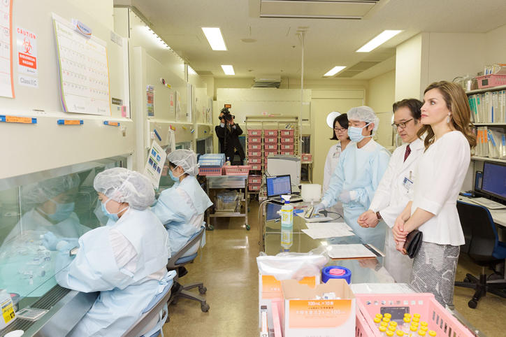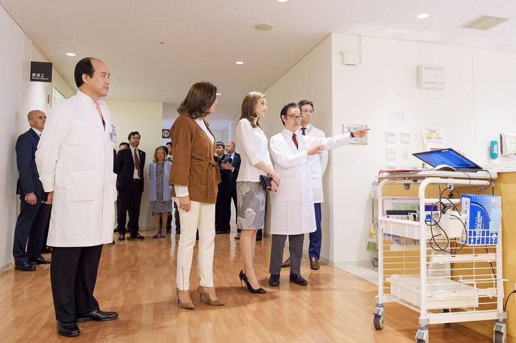 Officials, such as the Spanish State Secretary for Research, Development and Innovation Carmen Vela Olmo of the Ministry of Economy, Industry and Competitiveness, and staff members of the Spanish embassy accompanied the queen on the tour of Keio University Hospital to take a look at how the university is engaged with the latest in medical care.