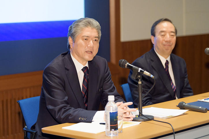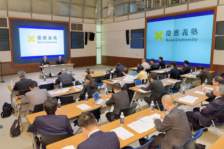 A press conference was held from 16:30 on Thursday, April 20, at the G-Lab in the East Research Building on Mita Campus by President Atsushi Seike and Professor Akira Haseyama of the Faculty of Letters and current Vice-President, who was selected earlier that day as the next president of Keio University by the Keio University Board of Councillors.