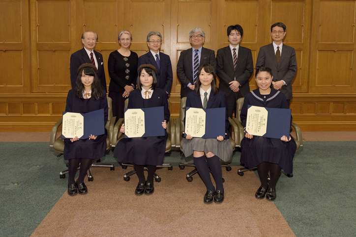 An award ceremony for the Keio University sponsored national high school student essay contest established in honor of Shinzo Koizumi, a former president of the university, followed. The winning essay was selected from among the 388 great works received, and the winner was given a certificate and commemorative gift from President Seike.