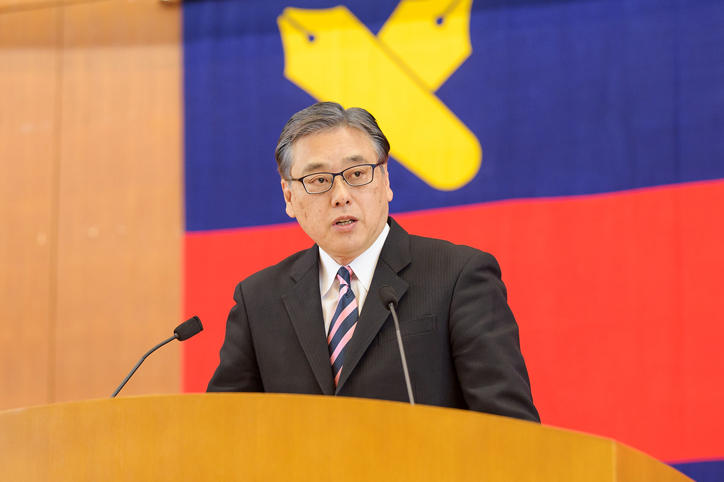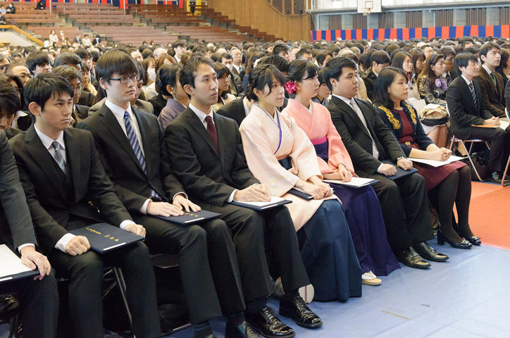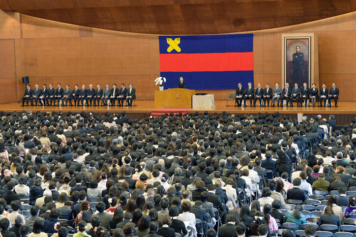 After Vice-President Akira Haseyama’s Graduating Class Report, the ceremony continued with President Seike's conferment of diplomas on a representative of Keio’s newest graduates from each graduate school, followed by his address. In his address, the president spoke of the importance of not only professional expertise, but also abilities that Yukichi Fukuzawa considered to be of great importance, namely public wisdom and being the guardian goose of society. In other words, this is the ability to evaluate what is important and to judge things and events from a long-term perspective. He also gave a speech in English for the international students among the graduates. Professor Ikuo Takahashi, a committee member of the Graduate School of Business and Commerce, then gave a congratulatory speech on behalf of the Keio faculty and staff. The ceremony ended with the singing of the Keio Alma Mater, "The Juku-ka," by all in attendance.