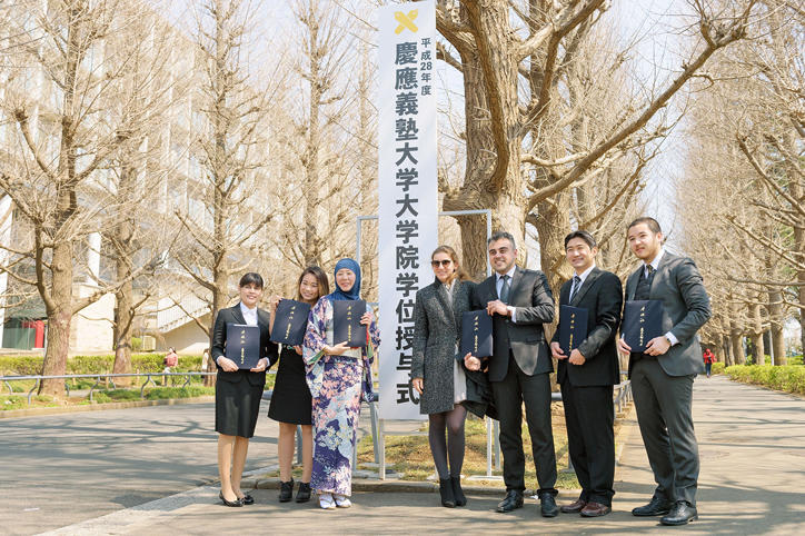 This year’s graduating class was a diverse group including international students, and graduates were of all ages and backgrounds. Many also brought their families along to Hiyoshi Campus to share in the special occasion. After the ceremony, graduates were conferred diplomas from their respective graduate schools, and took advantage of the sunny spring weather to take photographs. The campus was filled with a sense of celebration for their new start in life.