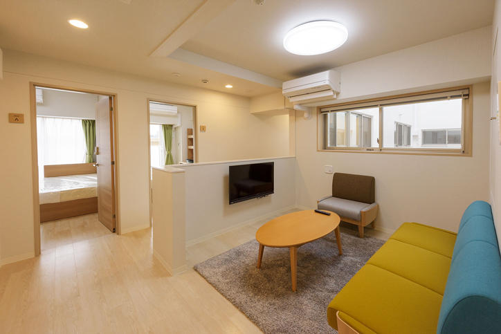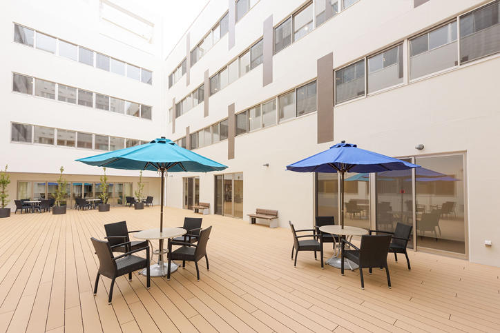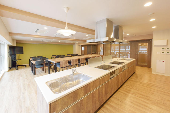 At the Hiyoshi International Dormitory, international students from around the world and Japanese students live together in units. It is Keio’s first dormitory of this type, which is designed to allow students to interact and learn from each other on a daily basis to foster international mindedness. There are a total of 200 rooms (4 students per unit × 50 units) in the building. Each unit contains 4 highly soundproof private rooms (2 for Japanese students and 2 for international students) and a shared living space, shower room, and wash basin. This setup ensures that the students have both their own private space and a space for interaction. Furthermore, there is a courtyard, meeting room, lounge, etc., where they can plan various exchange activities by themselves. A shared kitchen, dining room, a large communal bath, laundry room, etc., are also available inside the facility that students can make use of.