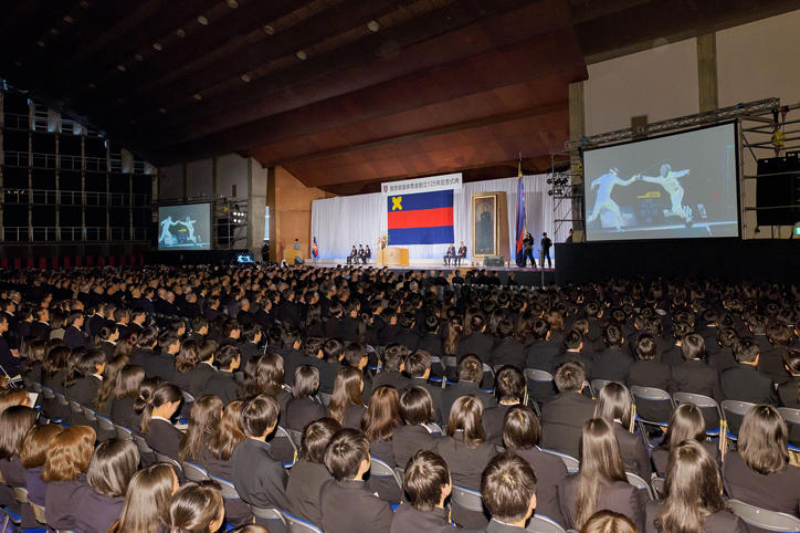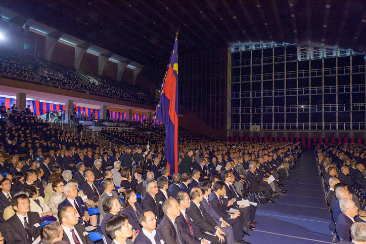 At the Hiyoshi Commemorative Hall, people associated with the Athletic Association, including active members, students from affiliated schools, staff and faculty members, over 1,300 alumni who were members of the Athletic Association (eldest was 97 years old), and managers and coaches of the 43 clubs of the Athletic Association gathered. Quoting former Keio University president Shinzo Koizumi—“practice makes the impossible possible”—in his speech, President Seike said the activities of the Athletic Association are the pride of Keio University. He gave words of encouragement to the members of the Athletic Association by saying that their efforts and hard work to be accomplished in both academics and sports are setting a good example and are an inspiration to all Keio University students.