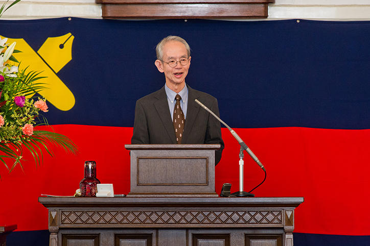 This year’s lecture took place at the Mita Public Speaking Hall (Mita Enzetsu-kan) on Monday, May 15. Professor Emeritus Naoyuki Agawa, who is currently a Distinguished Visiting Professor at Doshisha University, gave a lecture titled “The constitution translated by Fukuzawa: the way of the United States of America.” Fukuzawa translated the Constitution of the United States of America for his book titled "Things Western (Seiyō Jijō )". Professor Emeritus Agawa mentioned Fukuzawa’s visit to the US during its revolutionary period, before and after the American Civil War, and talked about what shapes a nation, its transformations, and how it relates to the establishment and revision of constitutions. To end his lecture, he quoted part of the Gettysburg Address, a speech given by Abraham Lincoln, the 16th president of the United States of America.