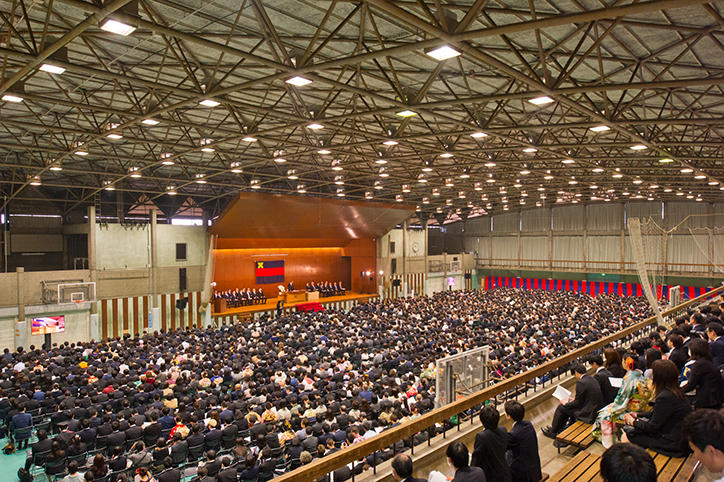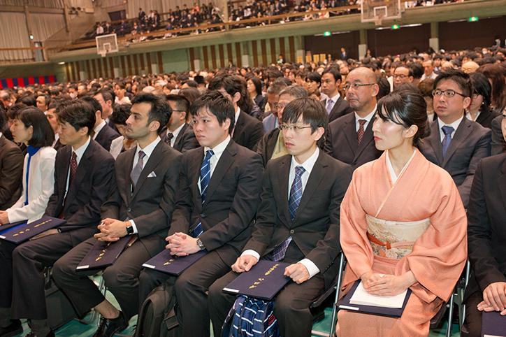 The 2018 Postgraduate Degree Conferral Ceremony was held on Wednesday, March 28, in the "Hiyoshi Kaido" Senior High School Gymnasium. The ceremony was this year held at Hiyoshi Kaido due to the reconstruction work currently underway at the site of the regular venue, the Hiyoshi Commemorative Hall. A total of 1,607 postgraduate degrees were conferred in the current academic year on students from 14 graduate schools (204 doctoral, 1,238 master’s, and 165 professional degrees.)