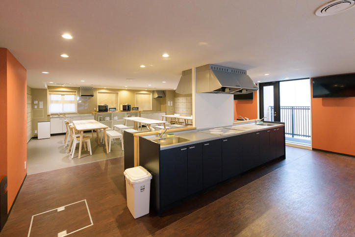 The Motosumiyoshi International Dormitory is a four-story mixed dormitory with a total of 156 single-occupancy rooms, 60 of which are intended for the use of international students and 96 of which are for Japanese students. At the canteen, morning and evening meals will be provided, which will greatly support the health of students. In addition, there are shared spaces for cooking and dining on every floor, as well as message boards, which are among the facilities which will encourage daily interactions between international students and their Japanese compatriots. This is a highly convivial living environment with excellent access from Motosumiyoshi train station, and convenient access to large supermarkets as well as convenience stores for shopping in the vicinity.