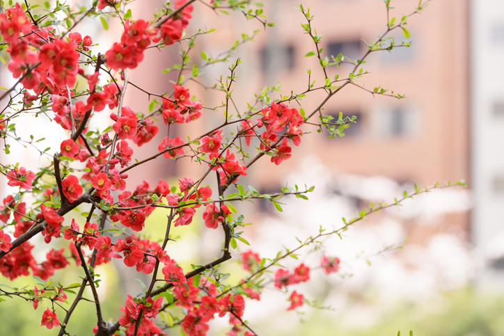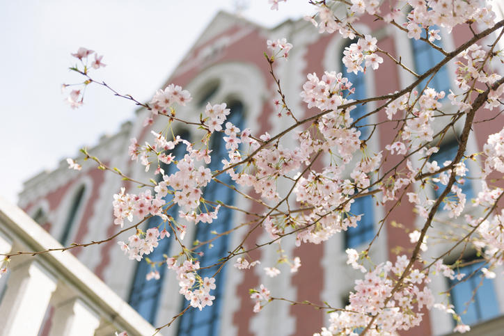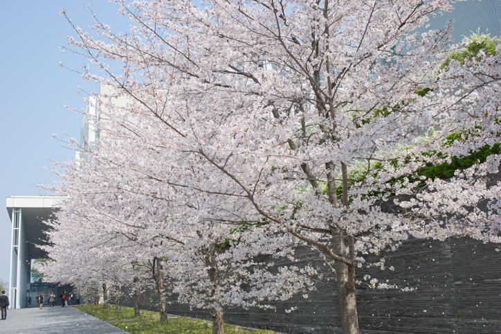 With the warm weather and sunshine arriving in March this year, the flowers have begun to bloom earlier than usual. Below the cherry blossom trees in full bloom and swaying in the gentle spring breeze, graduating students and many other people were seen taking photographs of the petals dancing down towards the ground. Now, fresh new buds and leaves are starting to grow and are welcoming the new students.