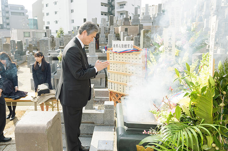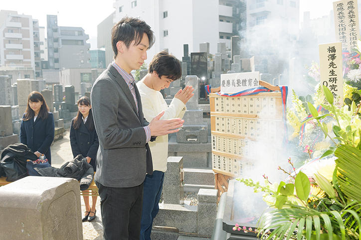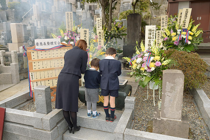 A Buddhist memorial service to mark the 118th anniversary of Yukichi Fukuzawa’s passing was held on Saturday, February 3 at Azabu-san Zenpuku-ji, a temple in Moto-Azabu, Minato City. Many people associated with Keio University prayed in front of Fukuzawa’s grave on this day dedicated to his memory and referred to as “Yukichiki,” including students from the affiliated schools to the university, alumni, and faculty and staff members. The long line of visitors making their way to the temple on a day with fine weather included students of Keio Yochisha Elementary School and Keio Yokohama Elementary School alongside their family members.