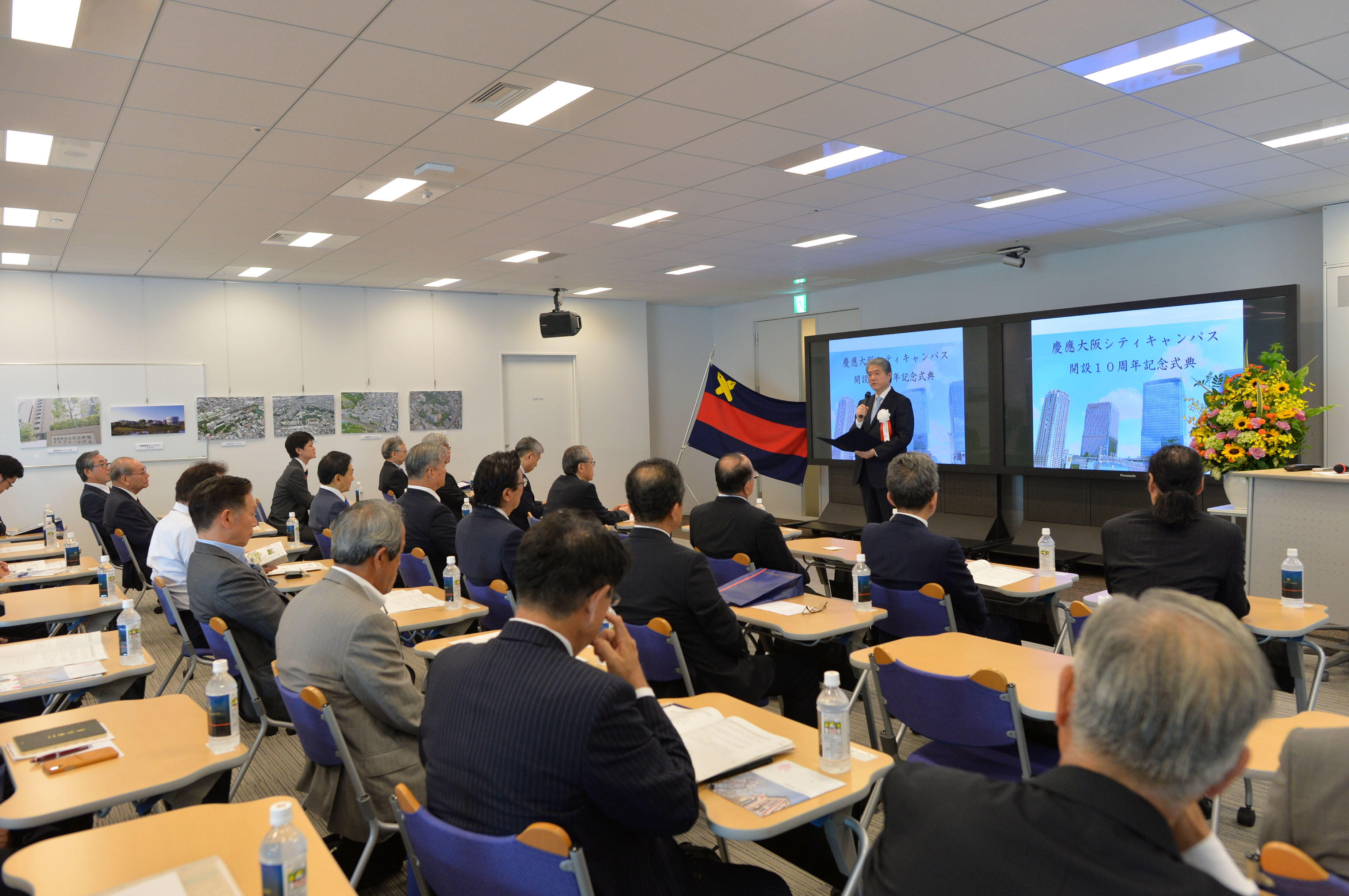 A ceremony to mark the 10th anniversary of the establishment of Keio Osaka City Campus (KOCC) was held on Friday, June 29. KOCC is a satellite hub for Keio University in the Kansai region which was established as the Keio Osaka Riverside Campus within the Dojima River Forum near a monument that commemorates the birthplace of Yukichi Fukuzawa in Osaka’s Fukushima Ward in 2008. It transferred all fronts to Knowledge Capital at Grand Front Osaka, adjacent to Osaka Station, in 2013.