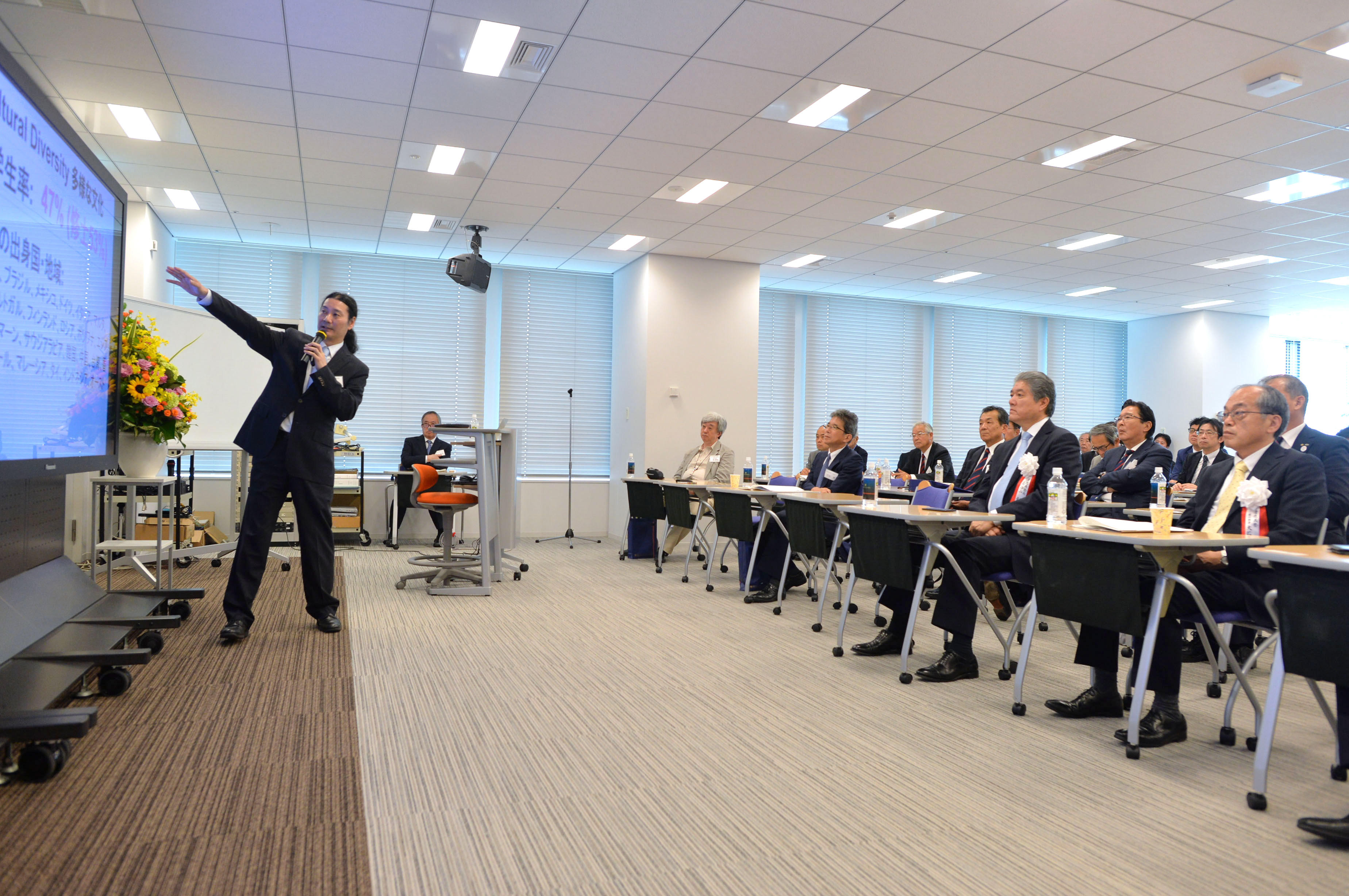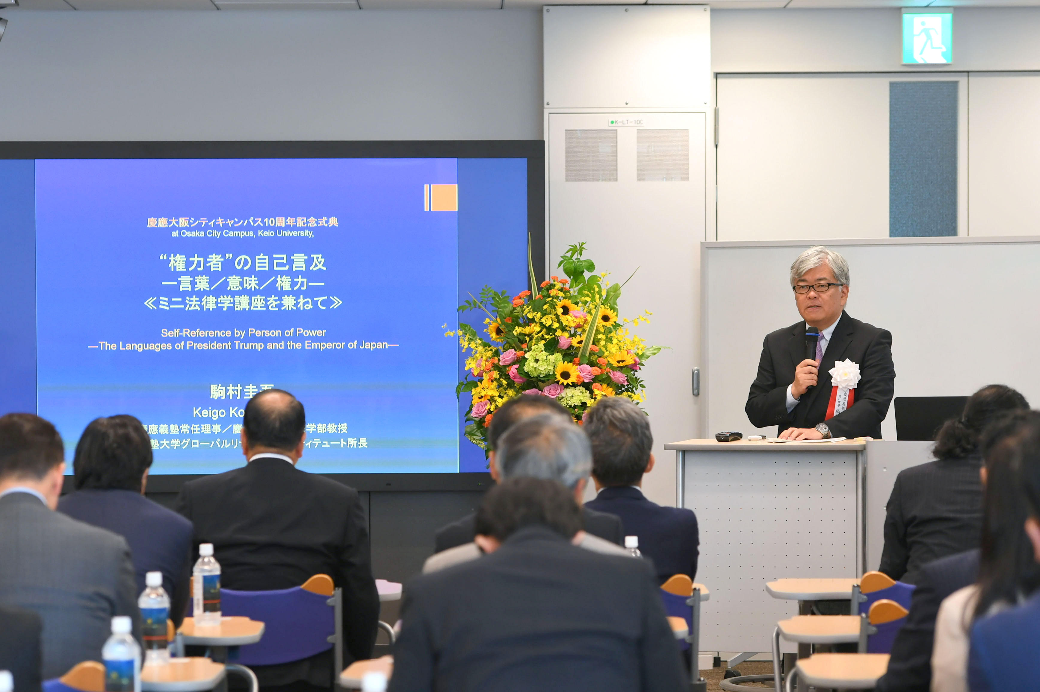 At the ceremony, there was an opening address by Vice President Yutaka Oishi and an address in the capacity of host by Keio President Akira Haseyama, during which they expressed their appreciation towards all concerned parties, in particular the members of the Kansai region Mita-kai (Alumni Association). They also expressed sympathy for the victims of the Osaka Earthquake of June 18. These were followed by a congratulatory address from Mr. Kazuyoshi Zenitaka, Chairperson of the Kansai Godo Mita-Kai, and commemorative lectures by Vice President Keigo Komamura and Professor Masahiko Inakage, dean of the Graduate School of Media Design, respectively titled "Self-described "Authorities": Words, meaning, and authority" and "Innovation recipes: What are innovation methods for the solution of social problems and proposal of new values?"