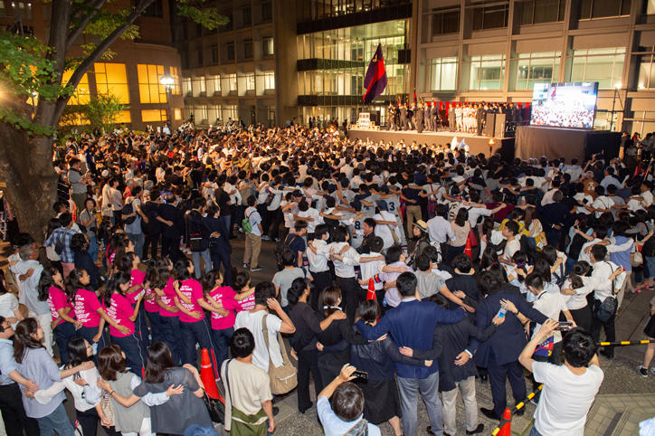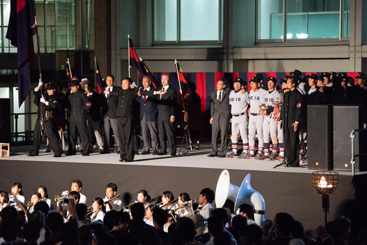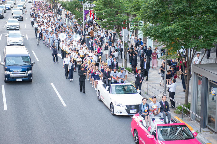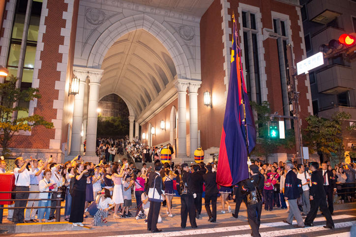 Following the end of the closing ceremony, a victory parade made its way from Meiji Memorial Picture Gallery in Mejijingu Gaien to the Mita Campus, where victory celebrations were held. Around 1,000 people took part in the parade and around 1,500 Keio students and jukuin (alumni) joined the victory celebrations and shared in the jubilation of the first consecutive league triumph in 27 years.