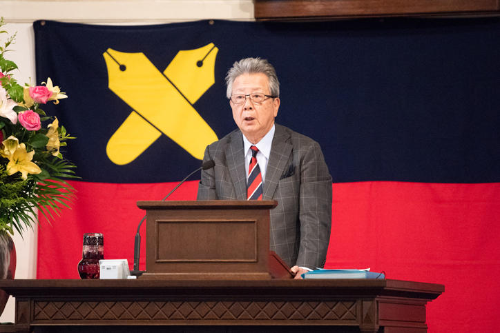 On Thursday, June 14, Keio University’s time-honored Mita Public Speaking Event was held at the Mita Public Speaking Hall (Mita Enzetsu-kan). At this 706th event, Takuo Takihana, former president of Yomiuri Shimbun, gave a lecture titled "Power of Authority and Journalism."