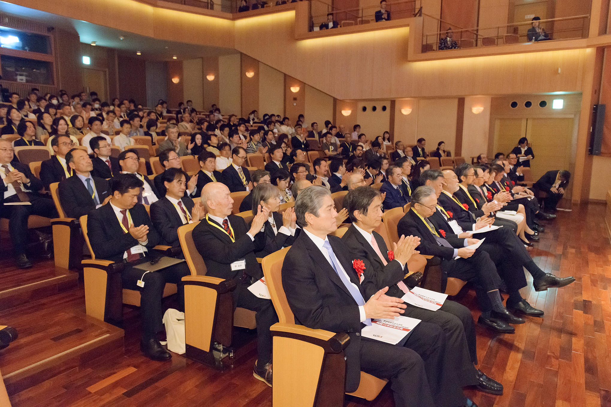 The ceremony was conducted in celebratory spirits at the Fujiwara Hiroshi Hall located in the Collaboration Complex on Hiyoshi Campus, and the venue was packed to near capacity with around 400 enthusiastic attendees. At the ceremony, President Akira Haseyama, Provost Tojiro Aoyama, Dr. Yuichiro Anzai, President of the Japan Society for the Promotion of Science (former President of Keio University), Mrs. Rumi Kurita, Chief of Kohoku Ward, Yokohama City, and other officials met and spoke about their expectations for SDM with messages of congratulations from six testimonial donors.