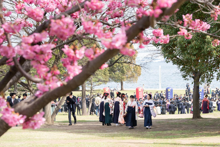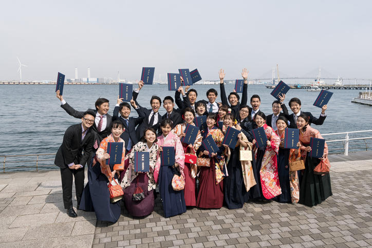 Under the warm spring sunshine and with the view of the ocean from Yokohama in the background, the graduates were seen taking commemorative photographs with their family and friends and fully enjoying the final moments of their university life.
