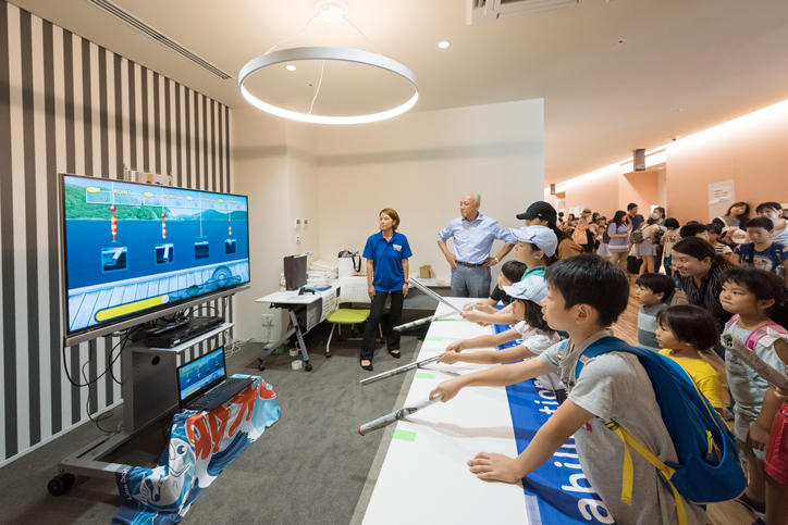 Tonomachi Town Campus hosted three booths: "The Junior Doctor Marshmallow Tower Experience!"; "Understanding Programming by Game Design"; and "Let’s Make Our Own Rods and Catch Fish!" This year, the advanced course "JST Junior Doctor Cram School" led the way as a platform for interim research presentations by the participating junior high school students. This was followed by "The Junior Doctor Marshmallow Tower Experience!" for elementary school students and their guardians, who were each assigned roles such as moderator. The participating children could be seen getting to grips with the games by trial and error and intently listening to the presentations by the junior doctors.