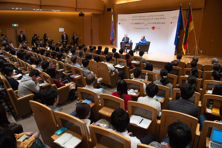 On Tuesday, February 5, German Chancellor Angela Merkel visited Keio University’s Mita Campus to engage in a dialogue with Keio students. Chancellor Merkel’s arrival onstage at the North Hall was greeted by enthusiastic applause from a full house consisting mainly of students.