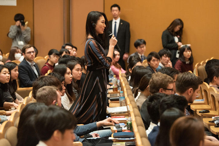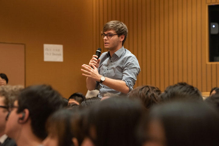 Following President Haseyama’s introduction, Chancellor Merkel expressed her delight at the opportunity to speak to Keio students, inviting them to query her about any issue they might have in mind. Students posed pointed questions on an array of topics, from mutual challenges of Japan and Germany and educational policy, through to dilemmas relating to technology including AI, personal data, and global security issues, resulting in lively and engaging interactions between the Chancellor and the enthusiastic attendees.