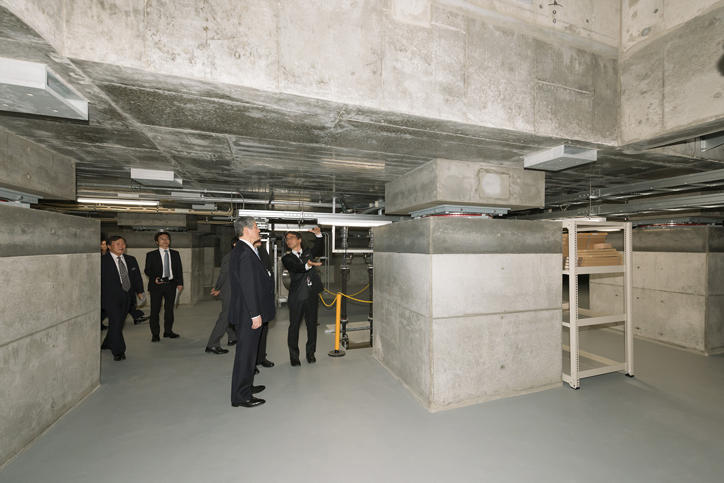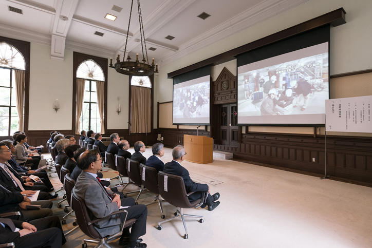 After the subsequent congratulatory addresses from attendees, a screening of file footage focused on the construction work was held. This restoration work used revolutionary base-isolation retro-fitting to install base isolation devices underneath the building without altering its form, and involved challenging and meticulous operations to work with an important cultural property built in the Meiji era. Following the ceremony, a tour of the building including the underground base isolation layer was conducted.