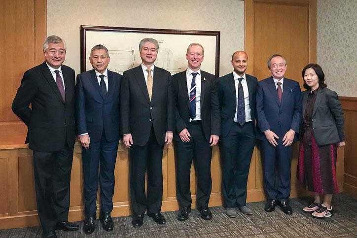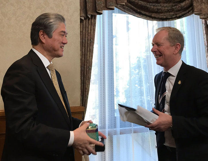 Mr. Andy Anson, the new CEO of the British Olympic Association (BOA), made a courtesy visit to President Haseyama at Keio’s Mita Campus on November 5. He was joined by Mr. Shahab Uddin, the Director of Legal at British Olympic Association. Also in attendance from the Keio side was Vice-President Naoki Watanabe, who is in charge of the Olympics and Paralympics, and Vice-President Shinnosuke Obi, who oversees International Collaboration.
