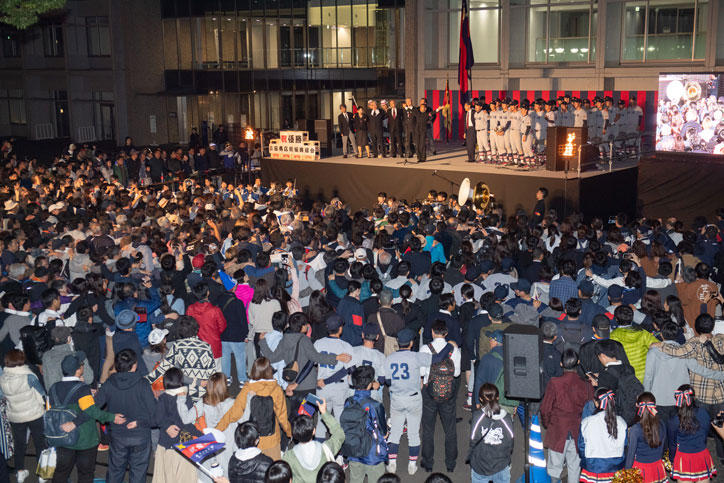 After the closing ceremony, a parade from the Jingu Stadium to Mita Campus was held followed by a victory celebration at the campus. About 750 people took part in the parade and around 2,000 people, including Keio students, alumni, and those from the neighboring areas, participated in the victory celebrations and shared in the joy of winning the tournament.