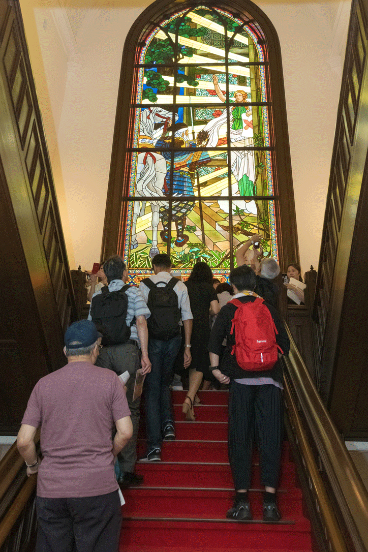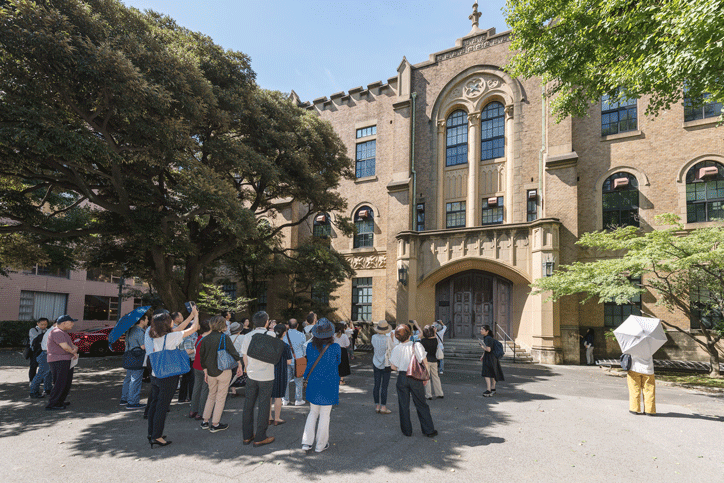 Participants could be seen throughout Mita Campus taking in the included facilities or posing for photographs with a map in one hand, as the Mita Enzetsu-kan (Mita Public Speaking Hall) and Ex Noguchi Room on the 3rd floor of the South Building, which are not normally not accessible, and the interior of the Old University Library, to which access is normally limited, were opened to the public. They could also be seen chatting with the curators, who fielded various questions about the history of the respective buildings and other matters, during and after the guided tour, held on both days.
