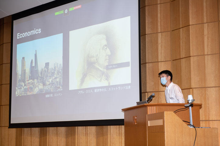 At the debriefing meeting, presentations by the eight students who took part in the study abroad program, including the two students who participated in the junior high school program which was introduced in the 2019 academic year, followed an address from Vice-President Masahito Omori. Due to the impact of the COVID-19 pandemic, the students participating in the program urgently returned to Japan in mid-March and remotely attended classes at the host schools. Although their time at the host schools was cut short, even under such circumstances, it could be seen from their talks that they had each taken on board many things and had grown through this experience.