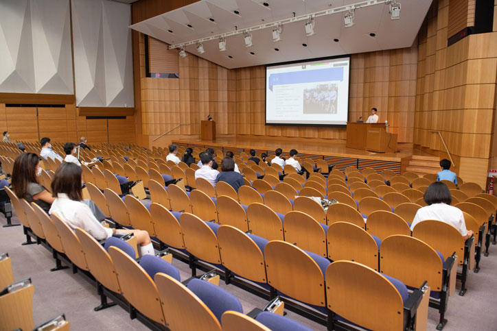 On Sunday, July 19, the study abroad debriefing meeting for participating students from Keio's affiliated schools in the 2019 academic year was held at the West School Building Hall on Mita Campus. Care was taken to ensure that participants could keep their distance from each other.