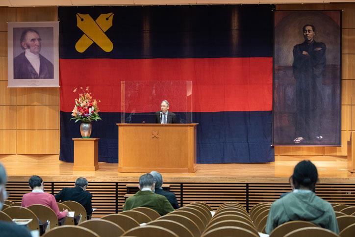 While the traditional venue for the lecture has been the Mita Public Speaking Hall (Mita Enzetsu-kan), it was this year held at the West School Building Hall in a format which maintained appropriate seating distance in order to prevent infections by COVID-19 (coronavirus disease), and the audience listened attentively to the lecture at this venue.