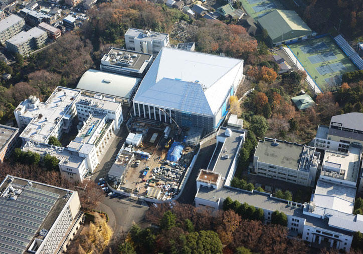 The Hiyoshi Commemorative Hall is mainly used for events such as university ceremonies and as a sports facility. The new building has four floors above ground and two below (the former had three floors above ground and one below) and has a seating capacity for around 10,000 people, a significant increase from the 6,500 of the former building. The size of the arena is also bigger, providing an improved environment for use as an indoor sports facility. The exterior design of the hall is in harmony with the surrounding school buildings, and it will become the new face of Hiyoshi Campus.