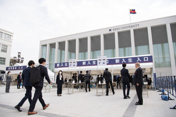 The AY 2021 Undergraduate Entrance Ceremony was held at the Hiyoshi Commemorative Hall on Thursday, April 1, 2021. It was the first time that the ceremony has been held on Hiyoshi Campus since 2017. A total of 6,462 students newly became members of the Keio community, joining the 10 undergraduate faculties and Japanese Language Program.
