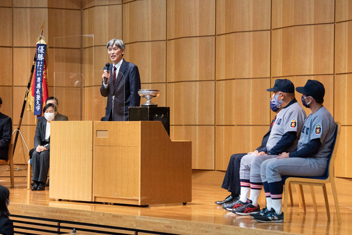 The celebration began with a performance from the Keio Cheer Group, followed by a greeting from President Kohei Itoh. In his remarks, President Itoh praised the Baseball Club for their triple-victory at the 2021 Spring Tokyo Big6 Baseball League, the Japan National Collegiate Baseball Championship, and the 2021 Fall Tokyo Big6 Baseball League, a first for the Keio Baseball Club. He followed with a rallying cry ahead of the upcoming Meiji Jingu Baseball Tournament.