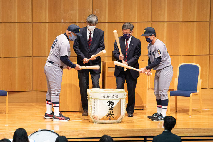 After President Itoh's message, Kenta Yamada, President of the All Keio Student Council delivered his remarks, which were followed by a kagami-biraki (breaking open of a ceremonial sake barrel) by President Itoh, Baseball Club President Kotaro Oka, Manager Tetsuya Horii, and Captain Shogo Fukui. Finally, after remarks from the Baseball Club and a Q&A with the players, the Keio School Flag was raised and all present were treated to renditions of the school songs "Keio Sanka" (Homage to Keio) and "Oka no Ue" (Up on the Hill).