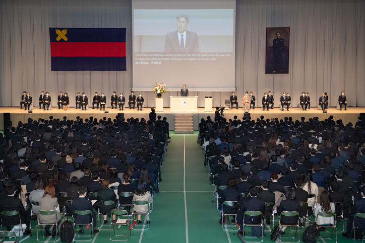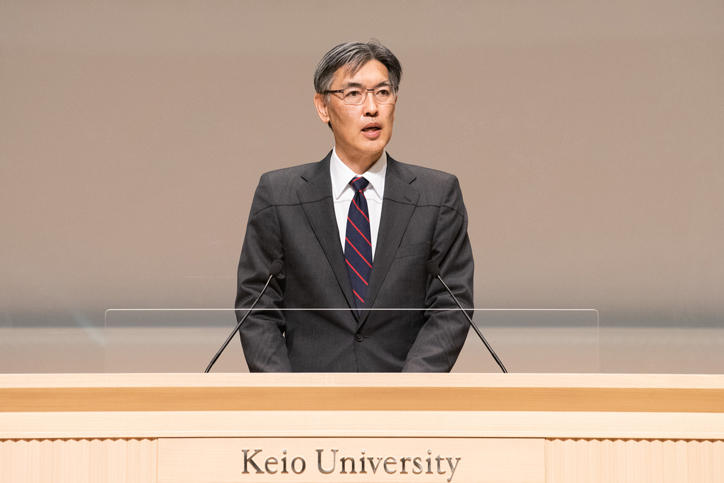 Vice-President Yoshimitsu Matsuura began the ceremony by delivering the Incoming Class Report, followed by President Itoh's Welcome Address. The President said that he hopes that the students will hone their "advanced expertise," "cultural skills and bird's-eye perspective," and "ability to read social trends on a global level," so that they may contribute to the development of society over the next 50 years together with people from all around the world by leveraging the universality of the pursuit of learning.
