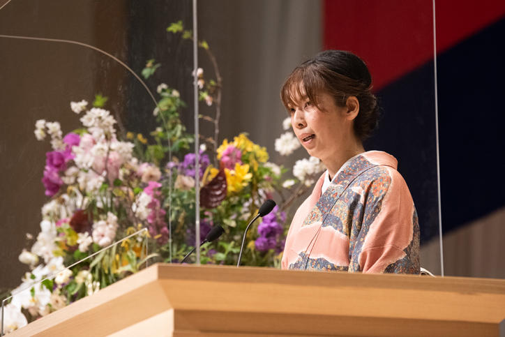 During the Congratulatory Address on behalf of faculty and staff that followed, Associate Professor Yuko Toukairin of the Graduate School of Media and Governance encouraged students to avoid remaining preoccupied with "how they compare to others or their personal feelings of self-worth" but rather to diligently apply themselves to their studies so that they may contribute to society through convictions rooted in "the kind of future that they want to create."