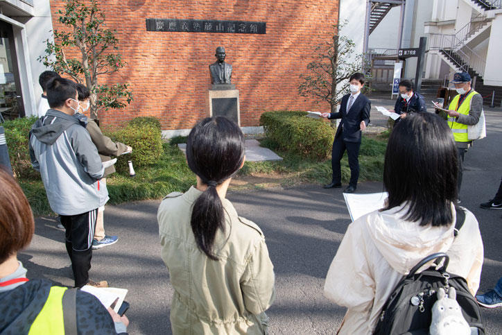 The tour took participants through various locations associated with Keio University and its founder Yukichi Fukuzawa, providing insight about their little-known histories and the characteristics that have been passed down from generation to generation. In the past, the program had been held in places throughout Japan such as Fukuzawa's birthplace in Osaka and Nakatsu City in Oita Prefecture, where he spent his childhood. Last year, the program stayed on Mita Campus to limit the spread of COVID-19. This year, tours were conducted first on Shinanomachi Campus, home of the Keio University Hospital. The tour was then held on Hiyoshi Campus, the base for many of Keio's student organizations and where a large number of first- and second-year students study.