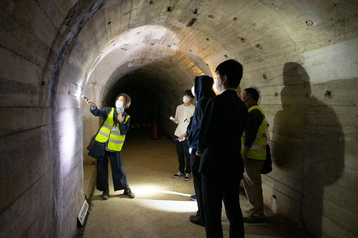 On Friday, March 10, both Associate Professor Tokura and Takeshi Akuzawa, president of Keio Senior High School, provided a tour on Hiyoshi campus. Participants deepened their understanding of the people and events crucial to Keio's history as they surveyed well-known spots such as the Bronze Statue of Yukichi Fukuzawa in front of the Hiyoshi Library (Hiyoshi Media Center) and other areas that are normally off-limits. With the cooperation of the Association for the Preservation of the Hiyoshidai Tunnels, participants also visited a wartime underground bunker that remains on Hiyoshi Campus to this day. The experience exploring the bunker provided a chance to reflect on life and learning during war, and complemented the tour's use of various photographic and audio materials.