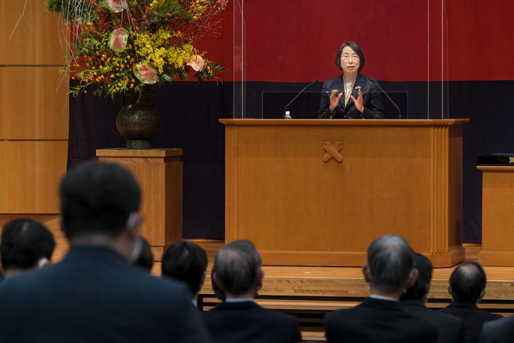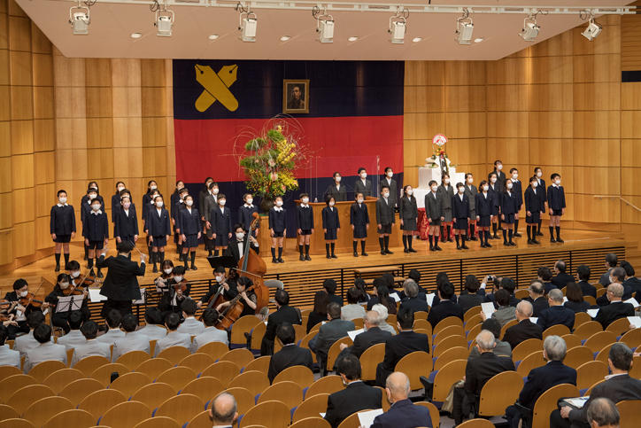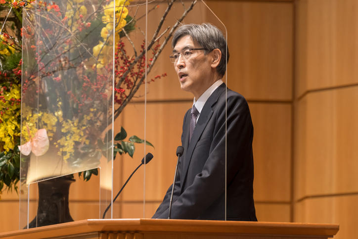 This year's ceremony began with choral performances of Here Stands Yukichi Fukuzawa, sung by students from the Keio Yochisha Elementary School and the Keio Yokohama Elementary School, and Nihon no Hokori (Japanese pride), sung by the Wagner Society Male Choir. Following these performances, President Kohei Itoh gave his new year's greeting, and Hiromichi Iwasa delivered his address as the Chair of the Board of Councillors.