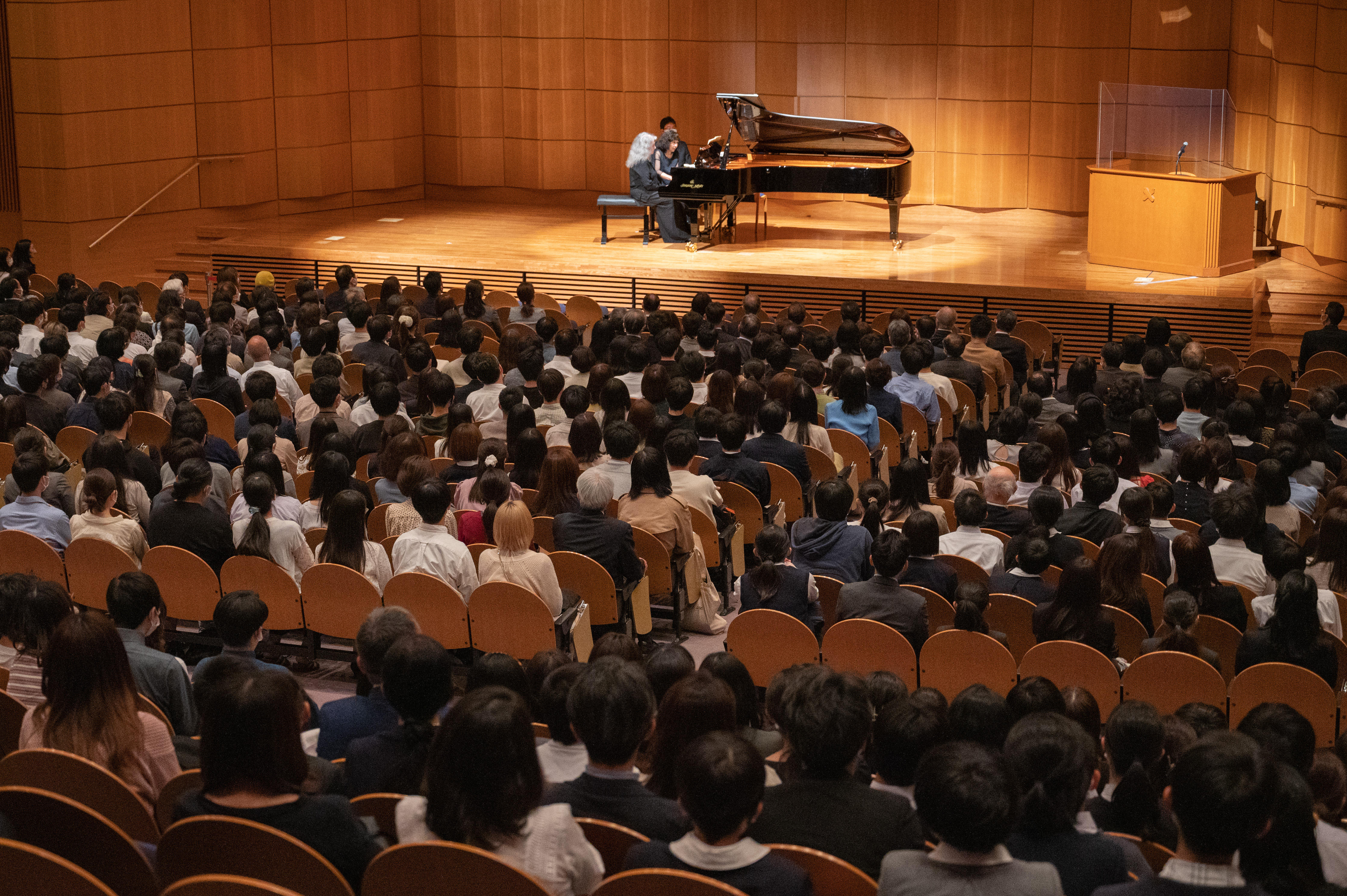 On Wednesday, May 10, 2023, Martha Argerich performed a piano concert at Mita Campus's West School Building Hall for Keio elementary, middle, and high school students, university students, board members, faculty, and staff members.