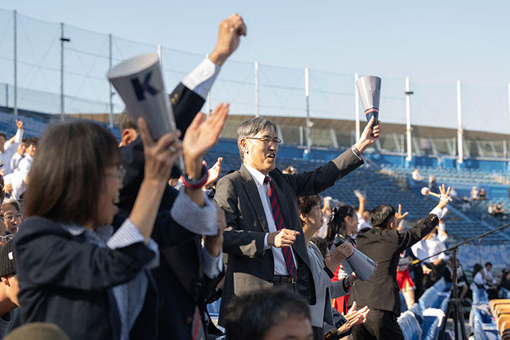 The two teams were tied one-for-one going into the third and final Waseda-Keio match. Keio led in the beginning, but impressive play from athletes on both teams from the bottom of the 5th inning to the bottom of the 7th inning saw that lead narrow, electrifying the audience in the arena. The end of the match in sight, the cheering sections for both teams poured out their support enthusiastically. Ultimately, after a blistering struggle, the Keio University Baseball Club emerged on top, securing a 5-3 victory to beat Waseda in the third match and take the Big6 championship.