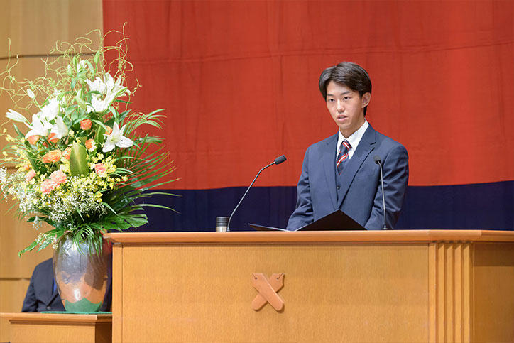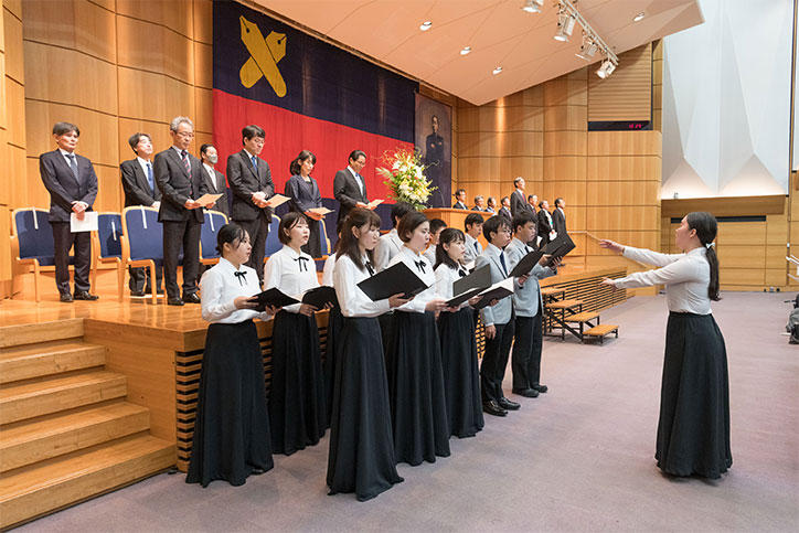 Once President Itoh finished his speech, Professor Keiko Okawa, a graduate school committee member for the Graduate School of Media Design, gave a congratulatory address on behalf of Keio's faculty and staff members. This was followed by Yu Shimizu, a new student in the Faculty of Law, delivering a matriculation address on behalf of the incoming class. The ceremony concluded with a rendition of the Juku-ka, Keio University's alma mater, sung by the Wagner Society Male Chorus and the Wagner Society Female Chorus, student organizations at Keio.