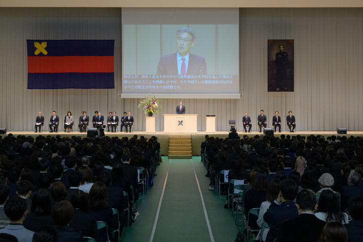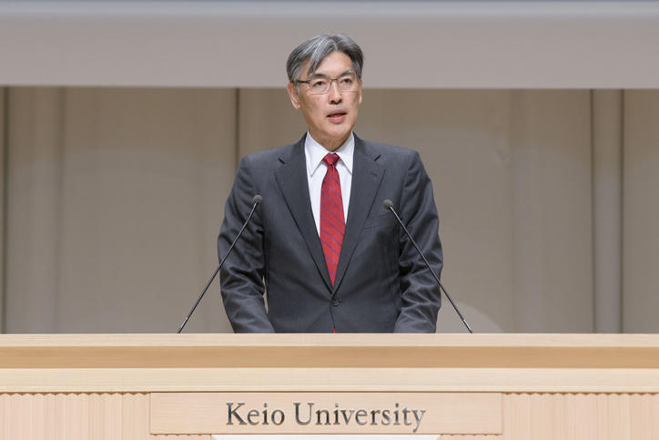 The ceremony began with Vice-President Yoshimitsu Matsuura delivering the Incoming Class Report, followed by the Welcome Address by President Kohei Itoh, in which he introduced The Mission of Keio University. President Itoh emphasized the importance of learning together with faculty and friends during classes and extracurricular activities, actively working to acquire the ability of lifelong learning, and venturing out into the world, in order to become leaders for all society. He also encouraged students to enjoy their student life without harming the dignity of others, and to always keep the "torch of learning" burning in their hearts, referencing the second verse of the Juku-ka, Keio University's alma mater.