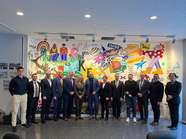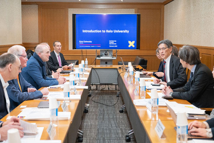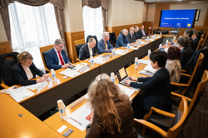 On February 8, a 10-member delegation led by Professor Ulrich Rüdiger, rector of RWTH Aachen University, visited the Mita and Yagami campuses. Founded in 1870, RWTH Aachen University is one of Germany’s leading technical universities. The exchange between Keio University and RWTH Aachen University stretches back about 70 years, mainly focused on the field of science and technology. In addition to researcher exchanges and the double degree program at the Graduate School of Science and Technology, there are now exchanges in a variety of fields, including joint research, university-wide student exchanges, and short-term programs, not limited to the field of science and technology.