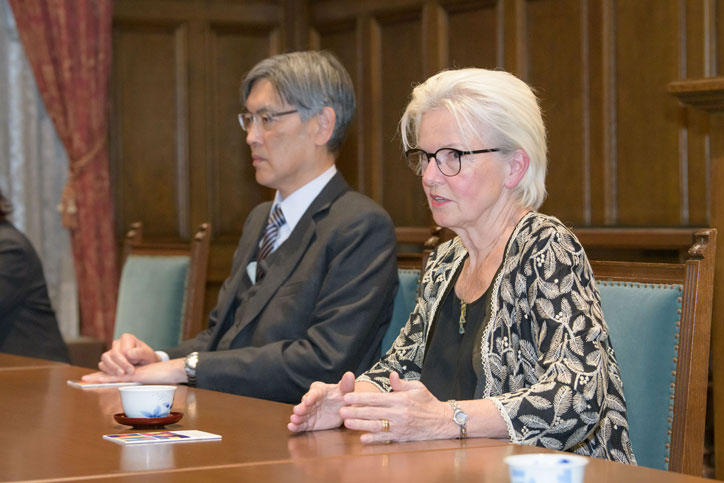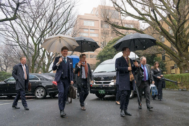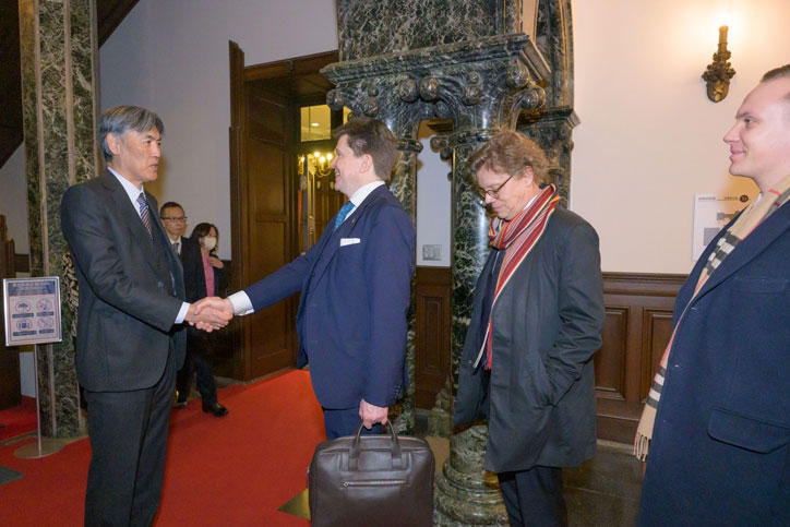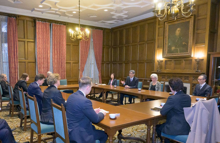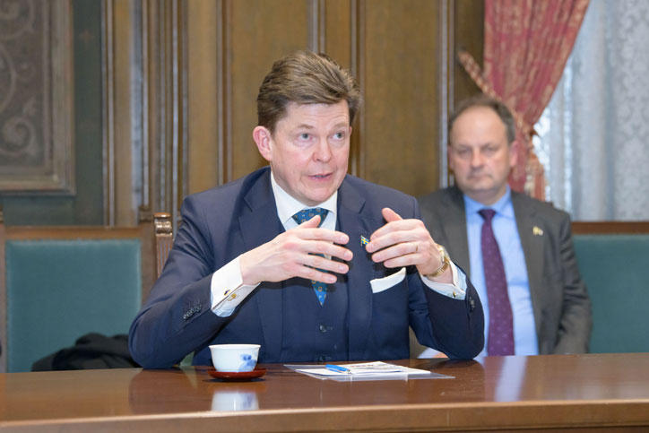 On February 5, a visiting delegation led by Speaker of the Swedish Parliament, Andreas Norlén, together with the Swedish Ambassador to Japan, Pereric Högberg, and the president of the Okinawa Institute of Science and Technology (OIST), Karin Markides, visited Mita Campus.