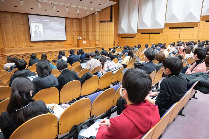 The opening keynote speech was delivered by Dr. Lena Okajima, CEO and founder of ALE Co., Ltd. She has experience in establishing a company and serving as its board member during her time as a university student. In her lecture, Dr. Okajima shared her career and research experiences from the perspective of a doctoral graduate who is active in fields other than academia. The audience listened attentively, gleaning deep insights on their future career and research.