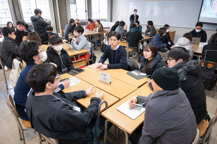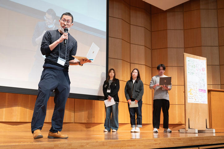 After that, the morning session was followed by breakout sessions on four themes — Health and Wellbeing Society, Cultural Diversity and Inclusive Society, Human-Machine Symbiosis, and Sustainable Society — leading to lively discussions. In the afternoon, students organized a two-part Student Session in which final-year doctoral students delivered presentations on their research during the first part, followed by questions and feedback on those presentations in the second part. Participants moved freely around the venue to listen to lectures and ask questions, while jotting down their learning points and thoughts on imitation vellum paper in real time. Afterwards, these reflections were shared with the whole group in the subsequent co-creation session.
