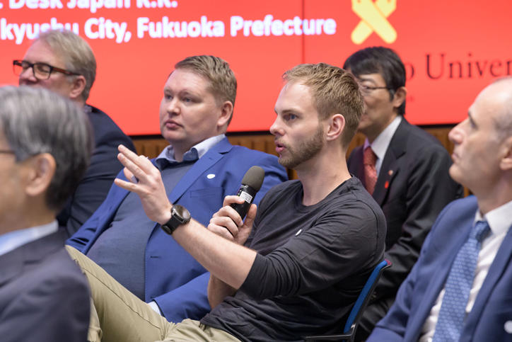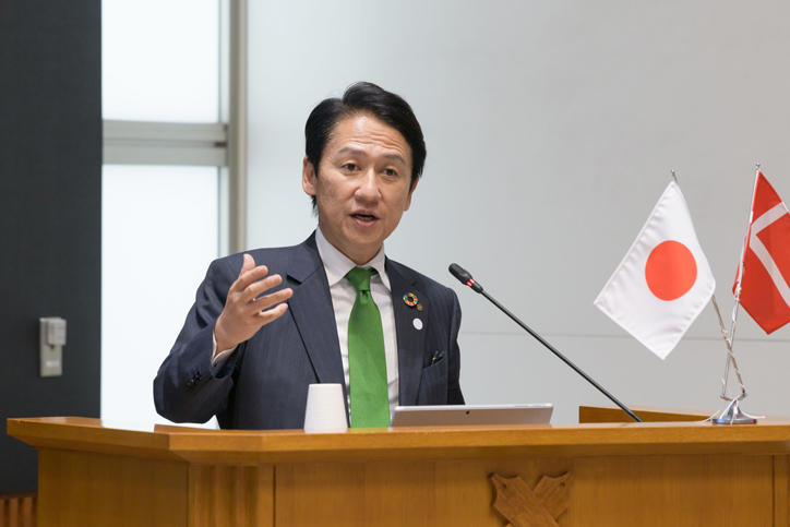 During the latter half of the symposium, CEOs from various Danish corporations took to the stage to introduce services they provide which rely on cutting-edge technologies and practical examples of how they have been implemented. Mayor Takeuchi from Kitakyushu then went into detail about the "SUMARAKU Ward Office Service Project" (
