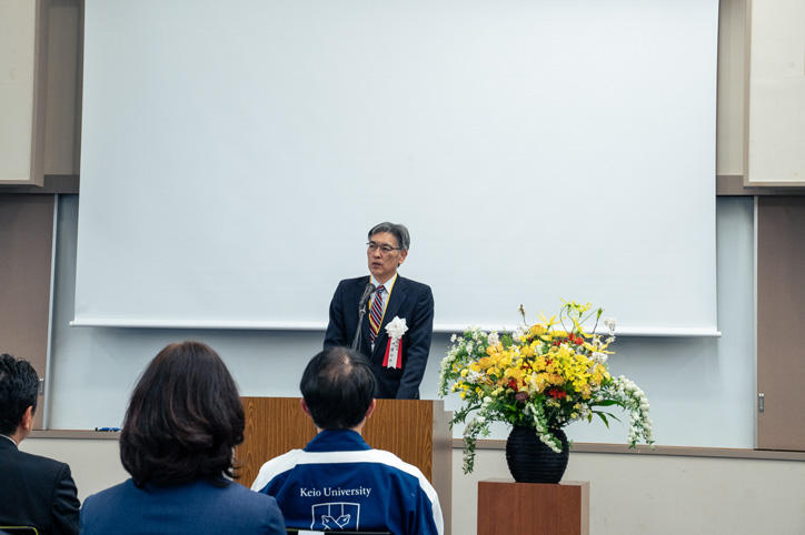More than 50 guests attended the opening ceremony including Keio University officials as well as personnel involved in the design and construction of the facility. The first half of the ceremony began with an opening address by Professor Toshiharu Saiki, dean of the Graduate School of Science and Technology, and Professor Toshiyuki Murakami, dean of the Faculty of Science and Technology, where they introduced the staff members at the YIL Management and Promotion Office. The guest of honor, Kazuhiko Kuniya, representative director and president of Hazama Ando Corporation, which was responsible for the design and construction of YIL, then gave a congratulatory address. After that, Professor Munehiro Tada from the Department of System Design Engineering, who also serves as director at the YIL Management and Promotion Office, spoke about the vision and action plan of how YIL will operate as a center for innovation, fostering a sense of unity among its members.