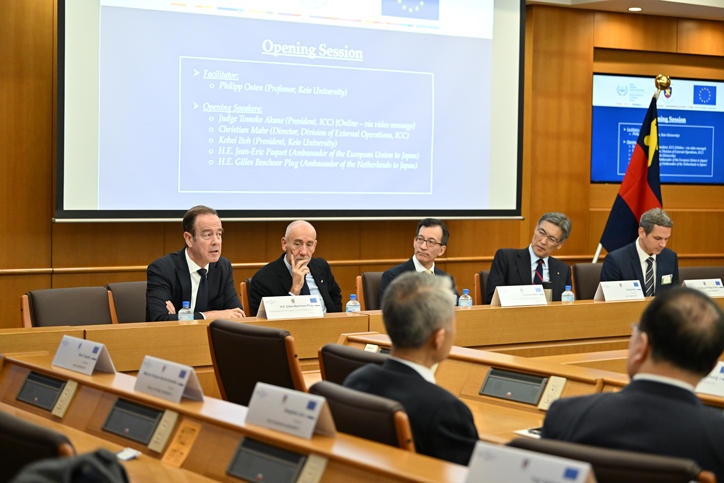 At the forum, universities in the Asia-Pacific region that are currently working with the ICC came together to meet in-person, promoting academic understanding of the ICC and discussing avenues for future academic cooperation in the region. During the opening session held on November 27, a video message from Judge Tomoko Akane, President of ICC kicked off the proceedings. After that, important figures took to the stage, including Ambassador Extraordinary and Plenipotentiary H.E. Jean-Eric Paquet of the European Union (EU) to Japan, Ambassador Extraordinary and Plenipotentiary H.E. Gilles Beschoor Plug of the Netherlands to Japan, ICC director Christian Mahr of the Division of External Operations, Keio President Kohei Itoh, and Professor Philipp Osten from the Keio University Faculty of Law, where they discussed the current crises that the ICC faces, and the importance of this framework, which transcends national and regional borders to play a role in international justice. Then, Keio president Itoh referenced President Akane's lecture that was held last year for Keio students, emphasizing the importance of academia's pursuit of truth and Keio's support for the ICC.