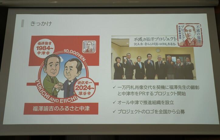 Mayor Okuzuka elaborated on a number of initiatives related to Fukuzawa Yukichi, including the construction of the school gate for Nakatsu City School (now Nanbu Elementary School) in 1871, a commemorative memorial service and lecture held on the anniversary of his passing, a speech contest for high school students nationwide held in commemoration of Fukuzawa Yukichi, a "Junior Yukichi" test for Nakatsu City junior high school students, and a Yukichi Karuta (card game) tournament for elementary school students, among other programs. He also spoke about the "Immortal Fukuzawa Project," which aims to pass on to future generations the achievements of Fukuzawa Yukichi, whose image had adorned the 10,000 yen note for the longest period of 40 years, as well as Fukuzawa's deep connection with Nakatsu, where he spent his formative years, from one and a half to nineteen years of age. He then went on to highlight Nakatsu's attractions as a tourist destination, such as a walking route utilizing old maps, the issuance of commemorative postage stamps, and a branded truck featuring a portrait of Fukuzawa Yukichi.